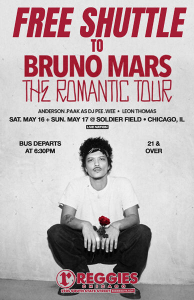 Start the party early at Reggies Music Joint, then hop on our FREE bus shuttles to see Bruno Mars at Soldier Field. Return trips back to Reggies will occur after concert ends!