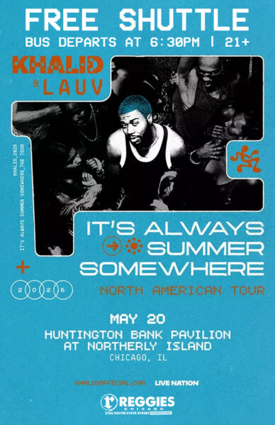 Start the party early at Reggies Music Joint, then hop on our FREE bus shuttle to Khalid at Huntington Bank Pavilion at Northerly Island! Return trips back to Reggies will occur after concert ends!