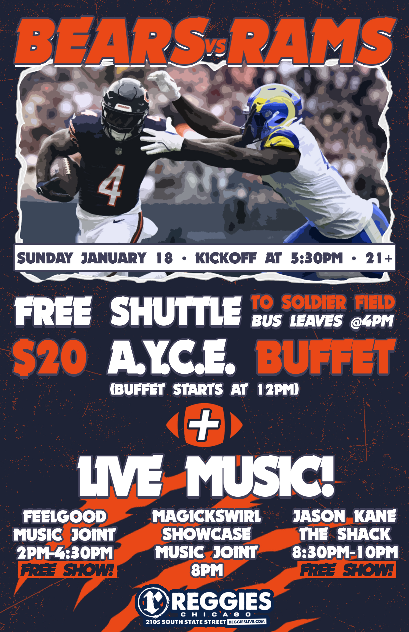 Free Bus Shuttles to Soldier Field before and after the game. First Shuttle Departs at 4pm. Multiple runs will be made till everybody gets to the game and back.