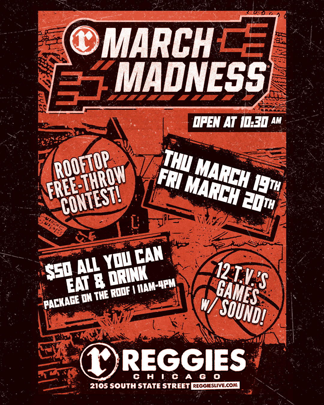open at 10:30 am!! watch games here with sound! Fri Mar 20 2026 Open at 10:30 AM, see all the March Madness Games with Sound here at Reggies! Rooftop and Music Joint will be showing all of the games Game Time Package – ROOF ONLY 11-4 $50 AYCE buffet + beers and call drinks Dine In Only MARCH MADNESS We’re kicking off March Madness this year with March Madness Specials .99cents wings Bucket specials See all the Games with Sound here at Reggies on the Roof or in the Music Joint!