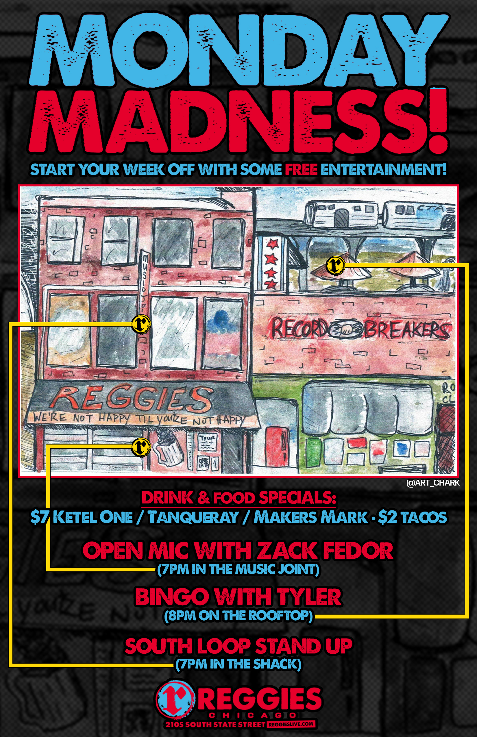 Comedians / Comedy / Stand Up Mon Mar 23 2026 SOUTH LOOP STANDUP A brand new standup comedy showcase in Chicago’s South Loop! Every Monday at Reggies! Instagram