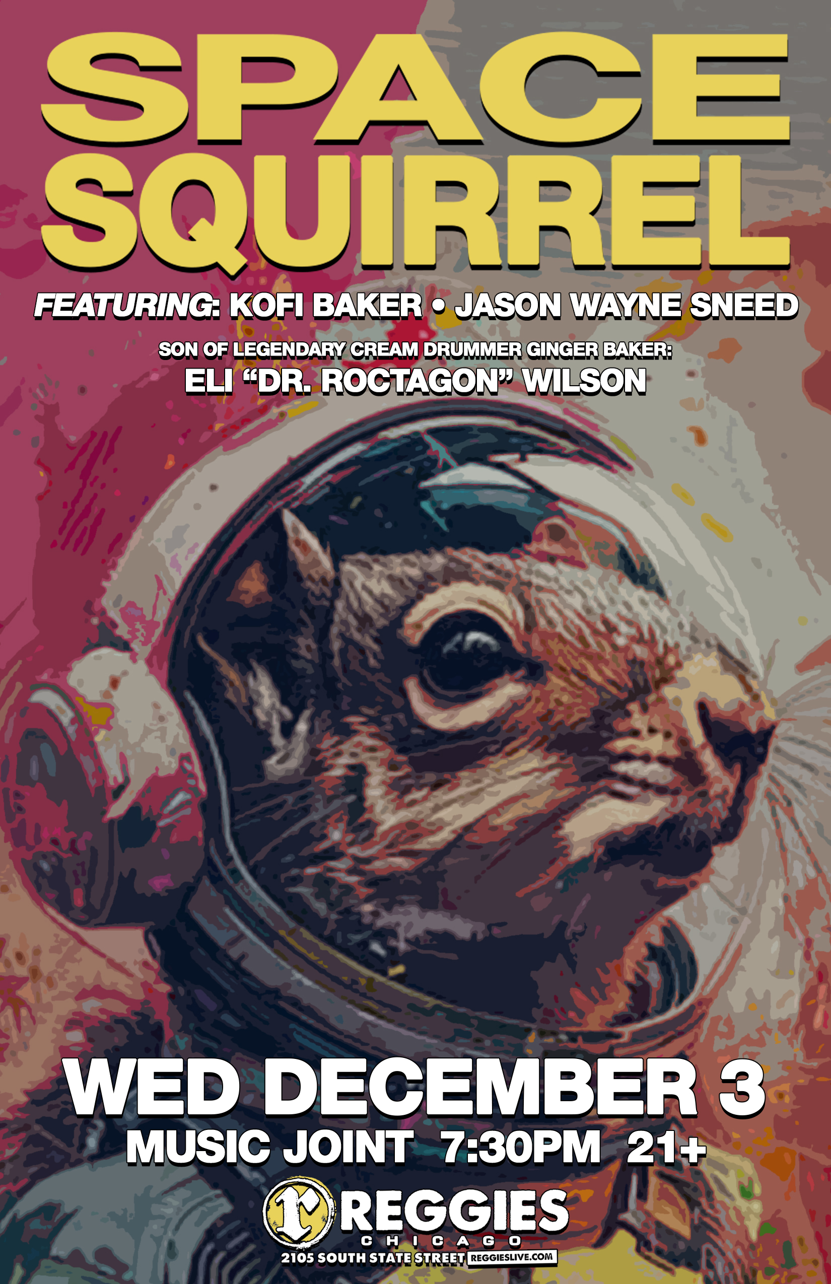 SPACE SQUIRREL, is a power Trio consisting of, Kofi Baker, Drums and percussion , son of legendary CREAM drummer Ginger Baker, Eli ( Dr. Roctagon ) Wilson, playing various saxophones with electronics, and Jason Wayne Sneed, playing Bass and electronics.