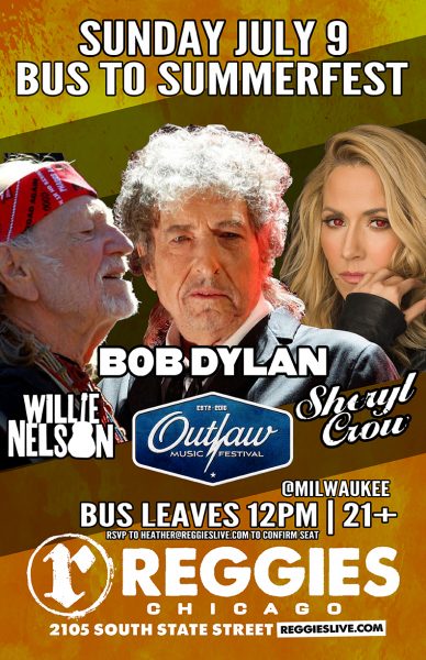 Offering a round trip bus run Sunday July 9 for Outlaw Music Festival featuring Willie Nelson, Bob Dylan, Sheryl Crow and more at Summerfest in Milwaukee. RSVP to heather@reggieslive.com to confirm your seat. Does not include concert ticket. Beers and water available to purchase on bus. Depart at noon from Reggies, return trip after the concert ends.