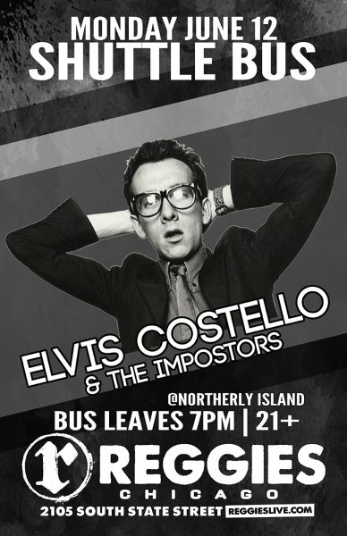 Start the party early at Reggies Music Joint, then hop on our FREE bus shuttle to go to see Elvis Costello & the Imposters at Huntington Bank Pavilion at Northerly Island! Bus will leave at 7pm, approximately 30 minutes before the concert begins. Return trip back to Reggies will occur after concert ends.
