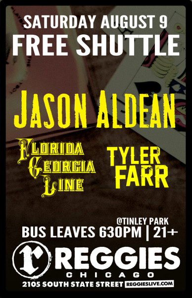 Start the party early at Reggies Music Joint, then hop on our FREE bus shuttle to go to First Midwest Bank Amphitheatre in Tinley Park to see the concert with Jason Aldean, Florida Georgia Line and Tyler Farr! Bus will leave approximately 1 hour before concert starts. Return trip back to Reggies will occur after concert ends.