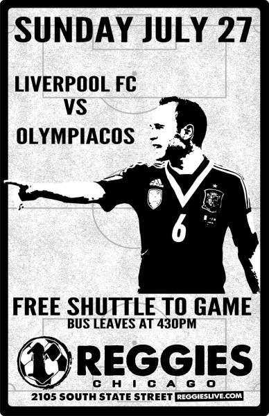 Start the party early at Reggies, then hop on our FREE bus shuttle to go to Soldier Field for the Soccer match between LIVERPOOL FC vs OLYMPIACOS!  Bus will leave approximately 30 minutes before the game. Return trip back to Reggies after it ends!