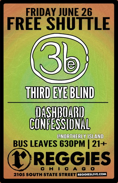 Start the party early at Reggies Music Joint, then hop on our FREE bus shuttle to go to see Third Eye Blind, Dashboard Confessional and K.Flay at FirstMerit Bank Pavilion at Northerly Island! Bus will leave approximately 30 minutes before concert, leaving at 6:30pm. Return trip back to Reggies will occur after concert ends.