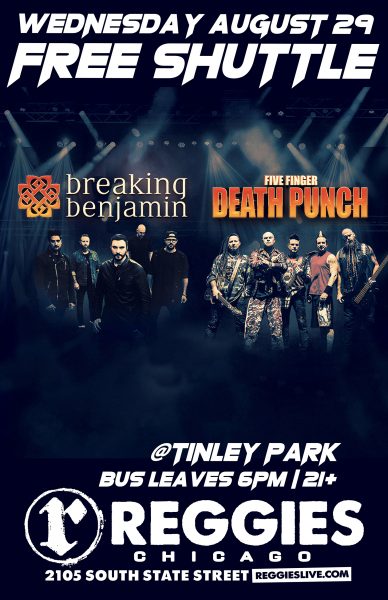 Start the party early at Reggies Music Joint, then hop on our FREE bus shuttle to go to see Breaking Benjamin and Five Finger Death Punch at Hollywood Casino Amphitheatre in Tinley Park!
