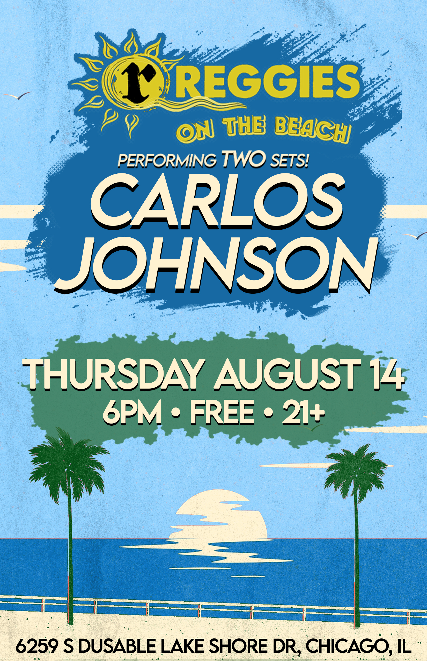 Enjoy a Free show with Carlos Johnson at Reggies on the Beach located at 63rd St.