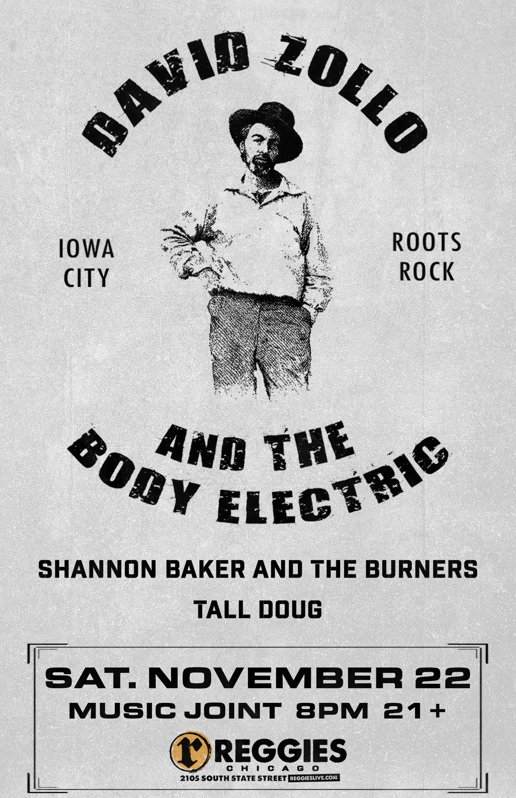 Since bursting on to the midwestern music scene with the band High and Lonesome in 1992, David Zollo has had a busy career. Along with constant touring, in the U.S and Europe, with High and Lonesome (1992-1998;) and his current band, The Body Electric (1998-present) Zollo has recorded 7 releases of his own material, including the most recent, “For Hire.” The current iteration of the band is his longest running, all four members playing together for a decade or more. It consists of Brian Cooper (drums, percussion,) Ryan Bernemann (bass guitar, harmony vocals,) and Randall Davis (electric, acoustic, and pedal steel guitars,” all of whom are some of the most in-demand musicians in the state of Iowa.