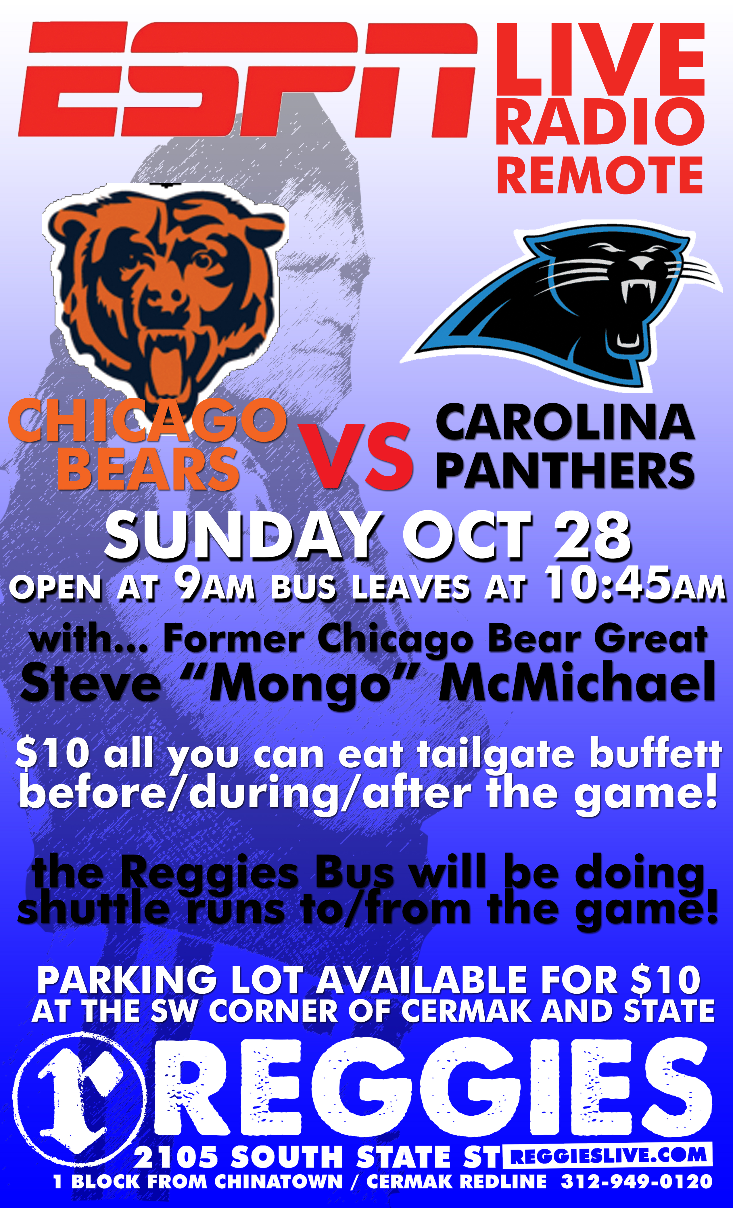 ‘MONGO’ Steve McMichael former Bear Great will be one of the ESPN Radio personalities at reggies!! Party Starts at 9:00am