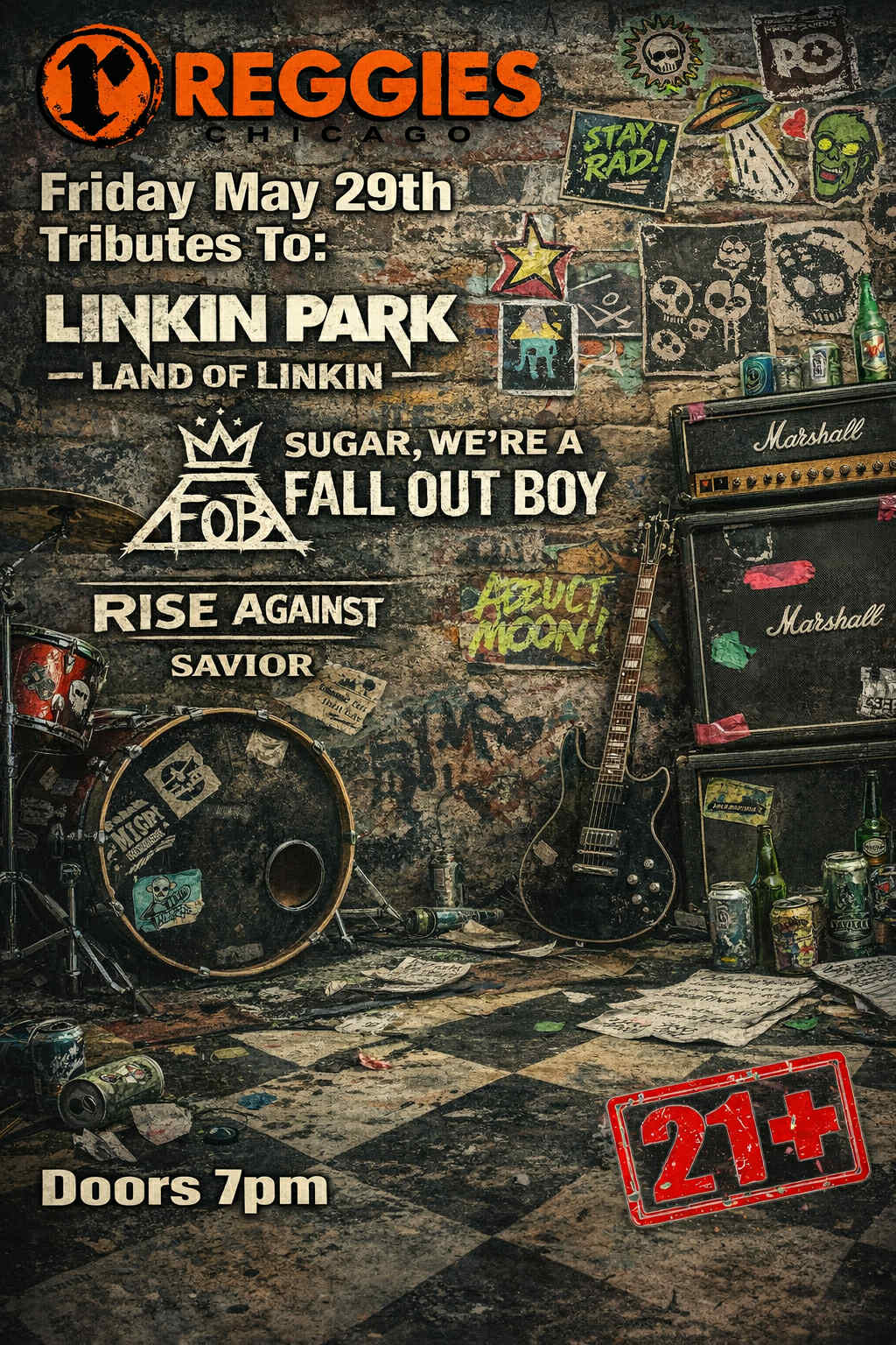 Emo / Rock / Tribute Fri May 29 2026 LAND OF LINKIN We are a Linkin Park tribute band based in Northern Illinois. We have an authentic tribute with all the Electronic sounds blended with the Dual Rap. Facebook SUGAR, WE’RE A FALL OUT BOY TRIBUTE (tribute to Fall Out Boy) The ultimate Fall Out Boy experience is here. SUGAR, WE’RE A FALL OUT BOY TRIBUTE delivers FOB’s biggest radio hits and deep tracks you love. 100% Fall Out Boy / Every Show / Period. Facebook Instagram SAVIOR (tribute to Rise Against) We are Chicagoland’s Tribute to Rise Against! Keep an eye out for show announcements. Facebook Instagram