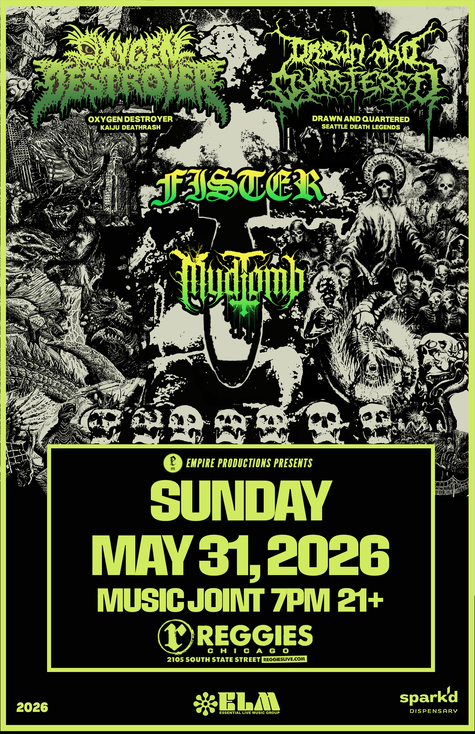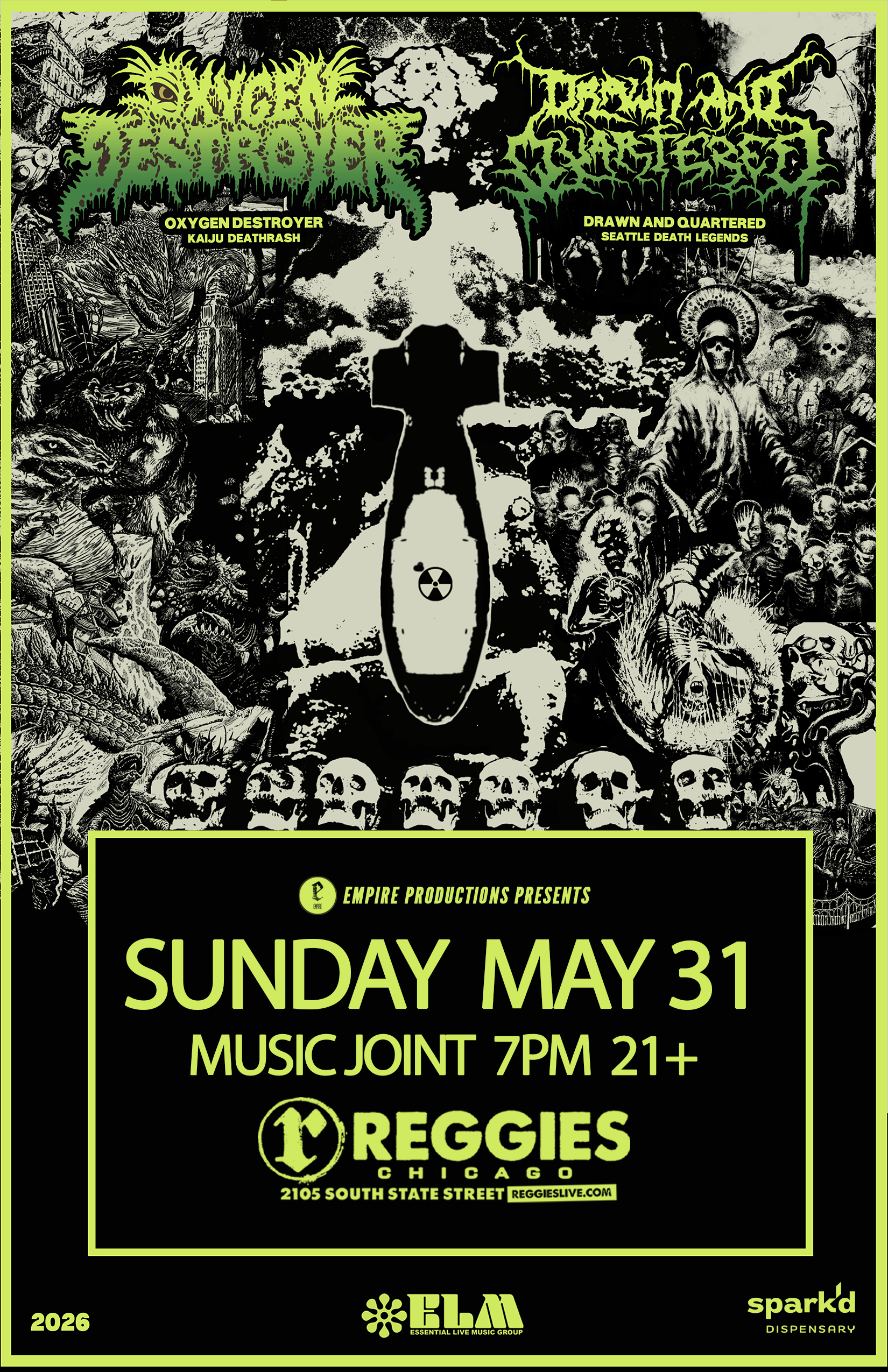 empire productions + spark'd present: Sun May 31 2026 OXYGEN DESTROYER Kaiju Conjuring Death/Thrash from Seattle/Portland Autumn Sky Passage by Jeff Scott Castle Spotify Facebook Instagram DRAWN & QUARTERED Classic death metal from Seattle since 1992! Dark atmospheres, melodic solos, incredible quality control, and brutal riffs across the decades have made Drawn and Quartered a legend in the underground death metal scene, with good reason! Autumn Sky Passage by Jeff Scott Castle Spotify Facebook Instagram TBA