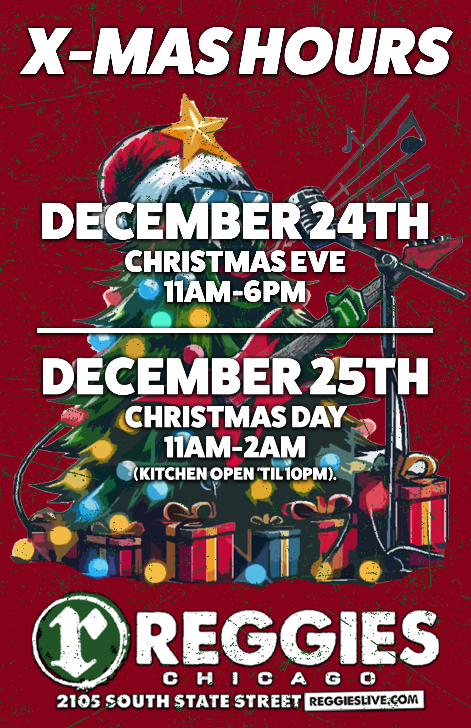 Holiday / Xmas Eve Wed Dec 24 2025 Xmas Eve Come hang out at Reggies on Christmas Eve. We will be open from 11am-6pm